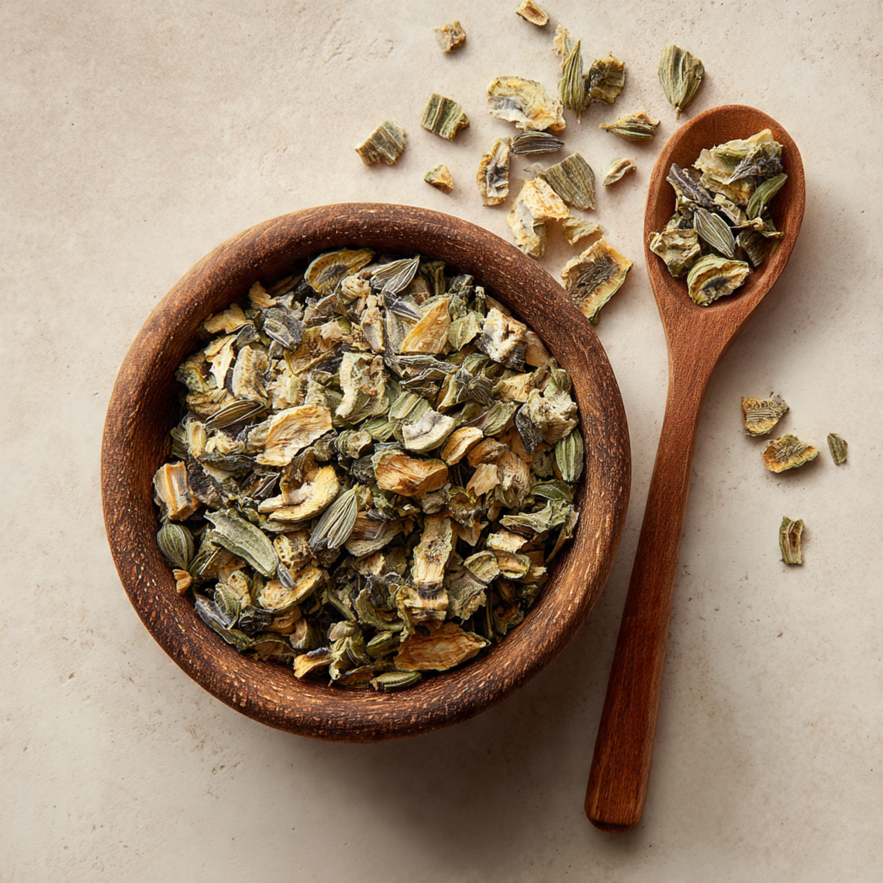 Momordica charantia produces elongated, warty fruits with a fibrous interior. When cut and sifted, the fruit retains its natural structure, texture, and subtle green hue. The cut-and-sifted form provides manageable pieces that blend easily into botanical mixtures, visual craft projects, and educational displays.