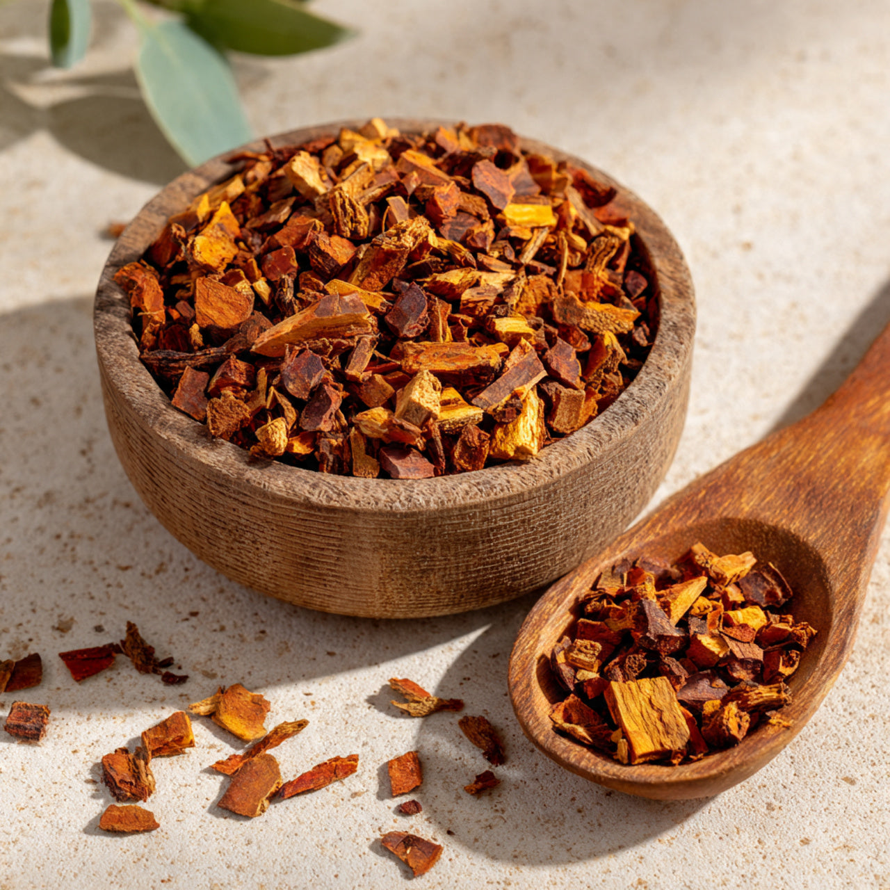 Sanguinaria canadensis develops thick rhizomes with a dense, fibrous texture that shows a natural red to orange colouring when fresh. When dried and processed, the pieces maintain their natural earthy tones and firm structure. The cut-and-sifted form provides manageable fragments that integrate easily into botanical mixtures, visual craft projects, and educational herb collections.