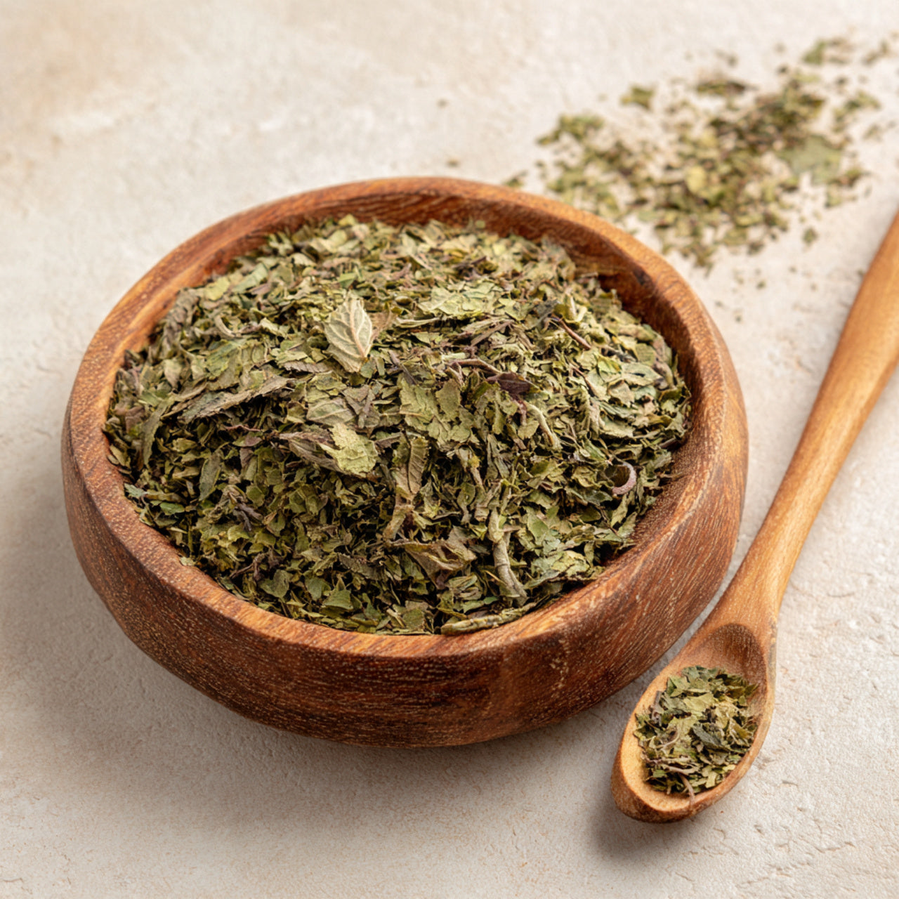 After harvesting, the leaves are cleaned to remove stems, dust, and field debris. They are then dried using controlled air-drying or low-temperature methods to reduce moisture while preserving the natural leaf structure and muted green to olive colour. Once dried, the leaves are cut and sifted into uniform pieces suitable for handling and blending.