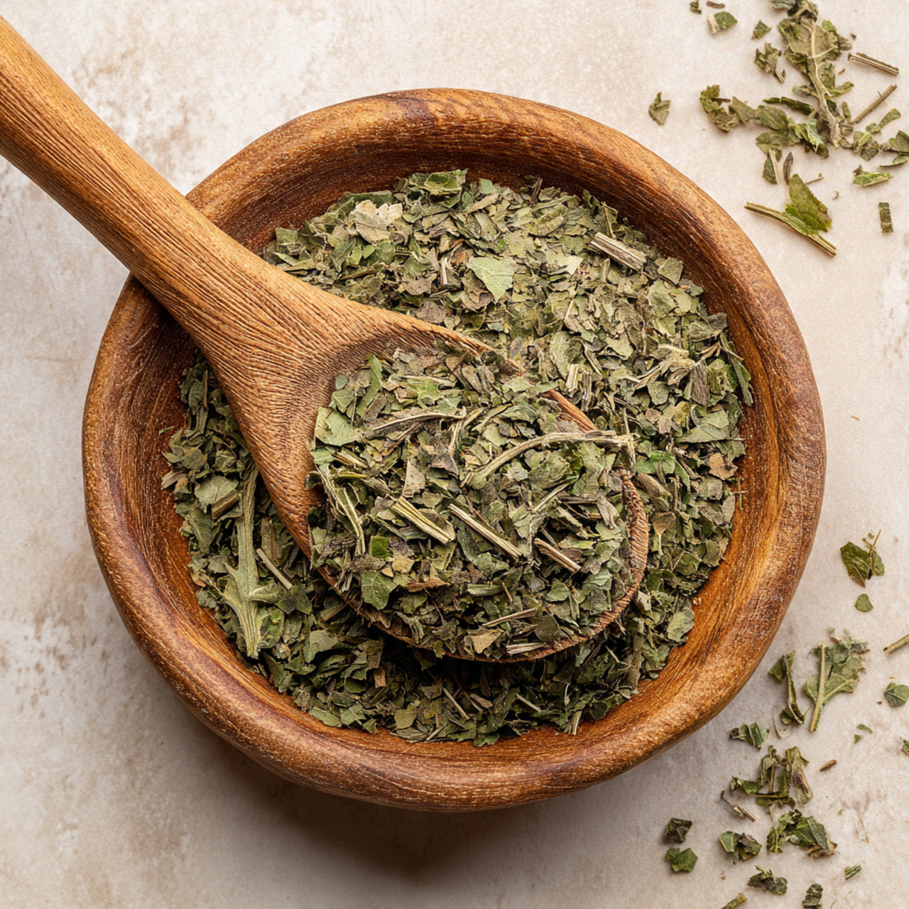 Once fully dried, the herb is cut and sifted into uniform pieces. The finished product contains flat leaf fragments and small stem sections with consistent size and texture, providing a clean and stable botanical ingredient suitable for blending, storage, and applications.