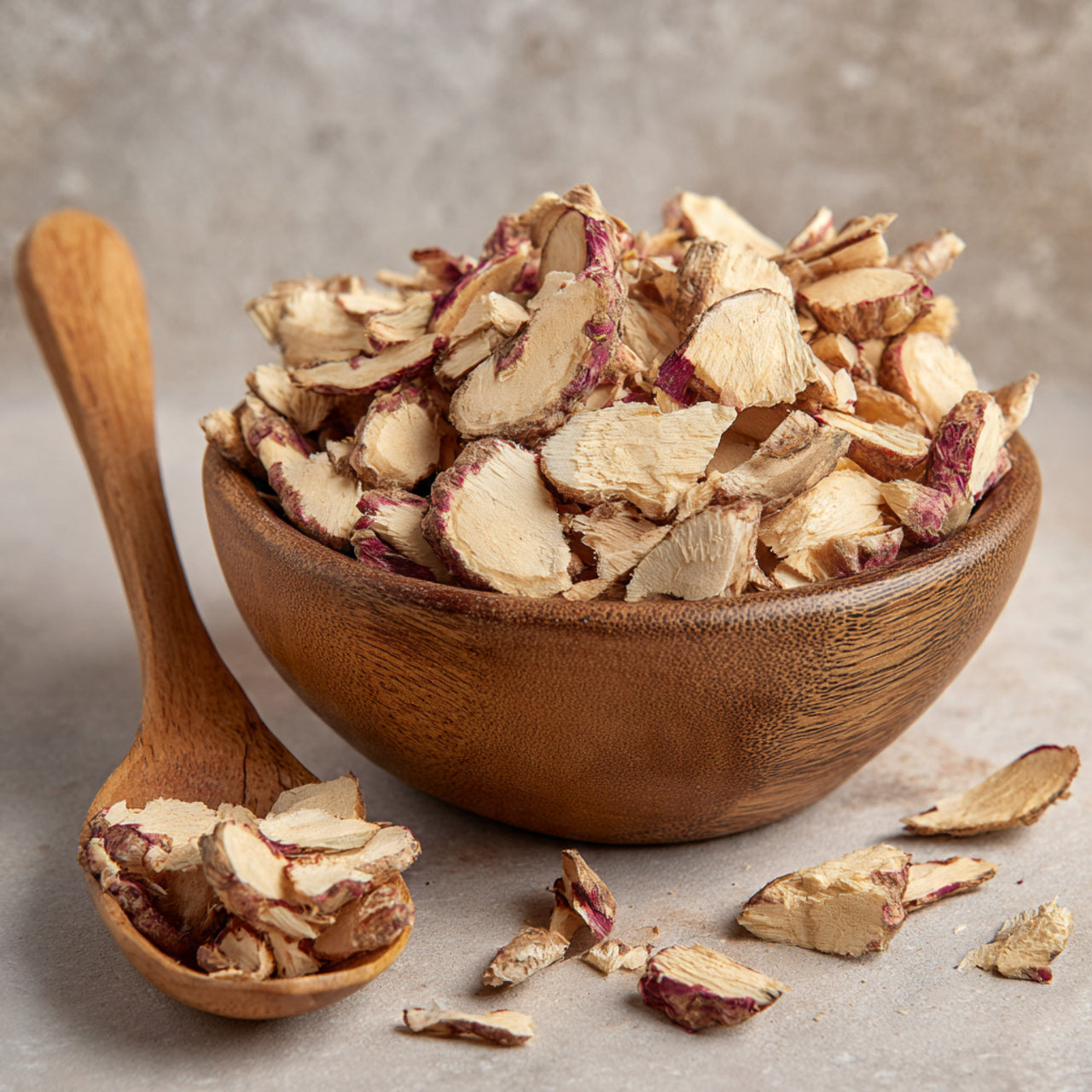 After drying, the root sections are cut and sifted into evenly sized fragments. The finished material displays a light tan to yellowish colour with fibrous edges and a dense internal structure, making it suitable for consistent blending and culinary preparation.