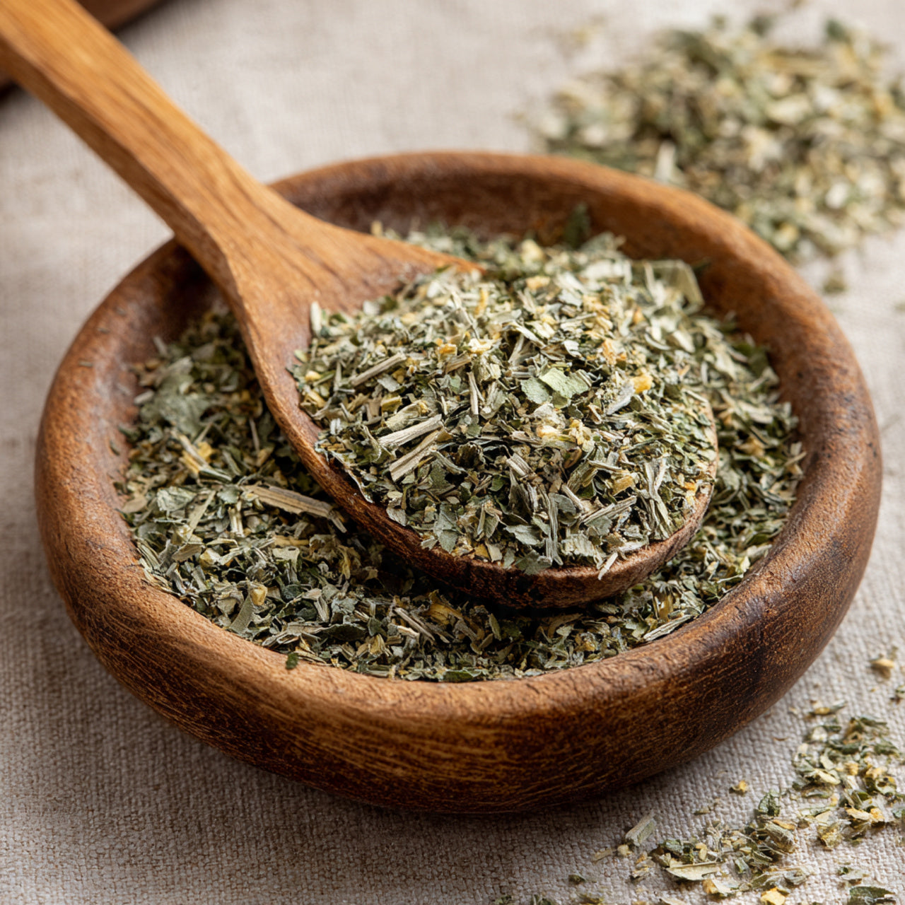 After harvesting, the leaves and tender stems are cleaned to remove dirt, stalks, and extraneous material. The plant material is then dried at controlled low temperatures to preserve the natural green to slightly yellowish colour and the texture of the leaves. Once fully dried, the herb is cut and sifted into uniform pieces with visible leaf and stem fragments. The final product is carefully sorted to remove fines and broken material, resulting in a clean, free-flowing herb suitable for blending, storage, and multiple applications.