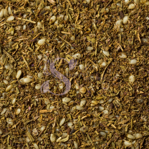 Za'atar comprises a flavorful spice mixture originating from the Middle East, crafted from dried oregano, thyme, sumac, and toasted sesame seeds.